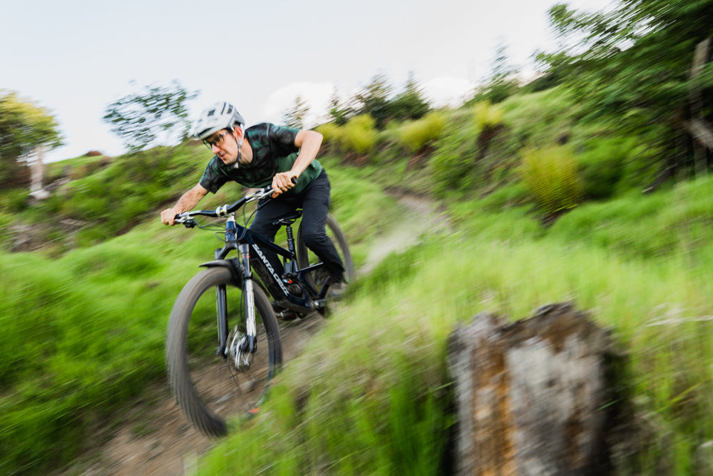 Visually similar to the other Santa Cruz trail bikes, the Megatower strikes a clean silhouette. Suspended on the now well established lower link VPP platform it runs on dual short links, yielding a stiff, solid frame with most of the mass down low and the shock well protected from crashes within the seat tube tunnel. With a 170mm fork coupled to 165mm rear travel, and running on a full 29’ wheel setup, it’s a bike that is going to let you ride as hard as you dare.